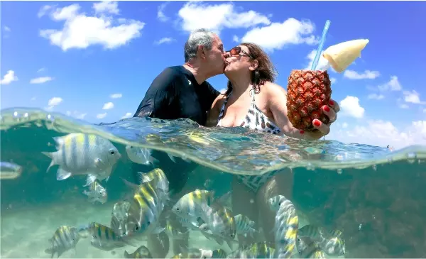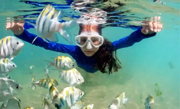 A experiência pode ficar ainda mais completa com opções incríveis: mergulho com cilindro, snorkel e sessões fotográficas subaquáticas que registram esse momento mágico com os peixes bem de pertinho.